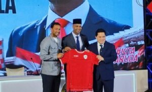 Patrick Kluivert mengenakan peci saat acara pengenalan jajaran pelatih Tim Nasional Indonesia. Peristiwa tersebut diselenggarakan di Hotel Mulia Senayan, Jakarta, pada sore hari, Minggu (12/1/2025).